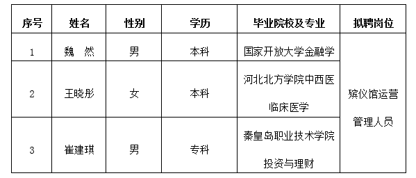 因公司發(fā)展需要,承德市國瑞置業(yè)有限公司委托第三方機(jī)構(gòu)面向社會(huì)公開招聘殯儀館運(yùn)營管理人員3名?,F(xiàn)對擬錄用人員信息進(jìn)行公示,公示期間如有異議,可通過電話、信函等方式反映,反映意見請署真實(shí)姓名。
