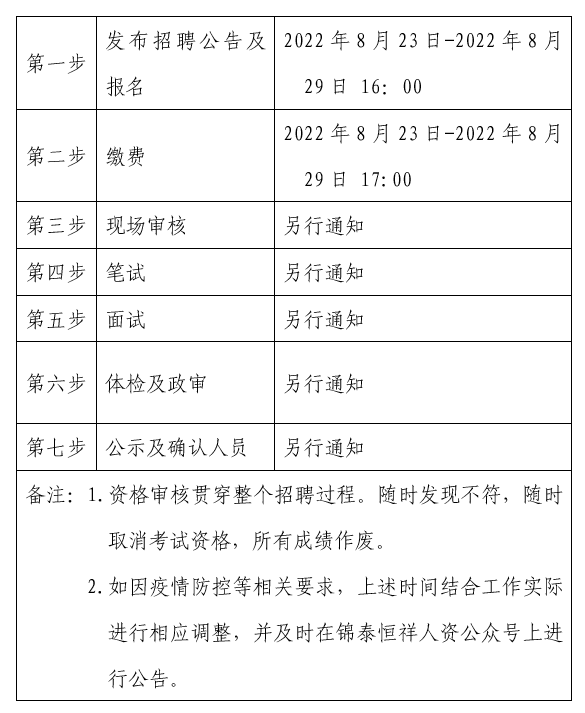 ?2022年8月23日-2022年8月29日 16:00在錦泰恒祥人資官網(wǎng)(www.jthxhr.com)、“錦泰恒祥人資”微信公眾號、“國控集團(tuán)”官方網(wǎng)站(www.7klyh.com)及上級部門要求的相關(guān)網(wǎng)站等發(fā)布招聘公告。
